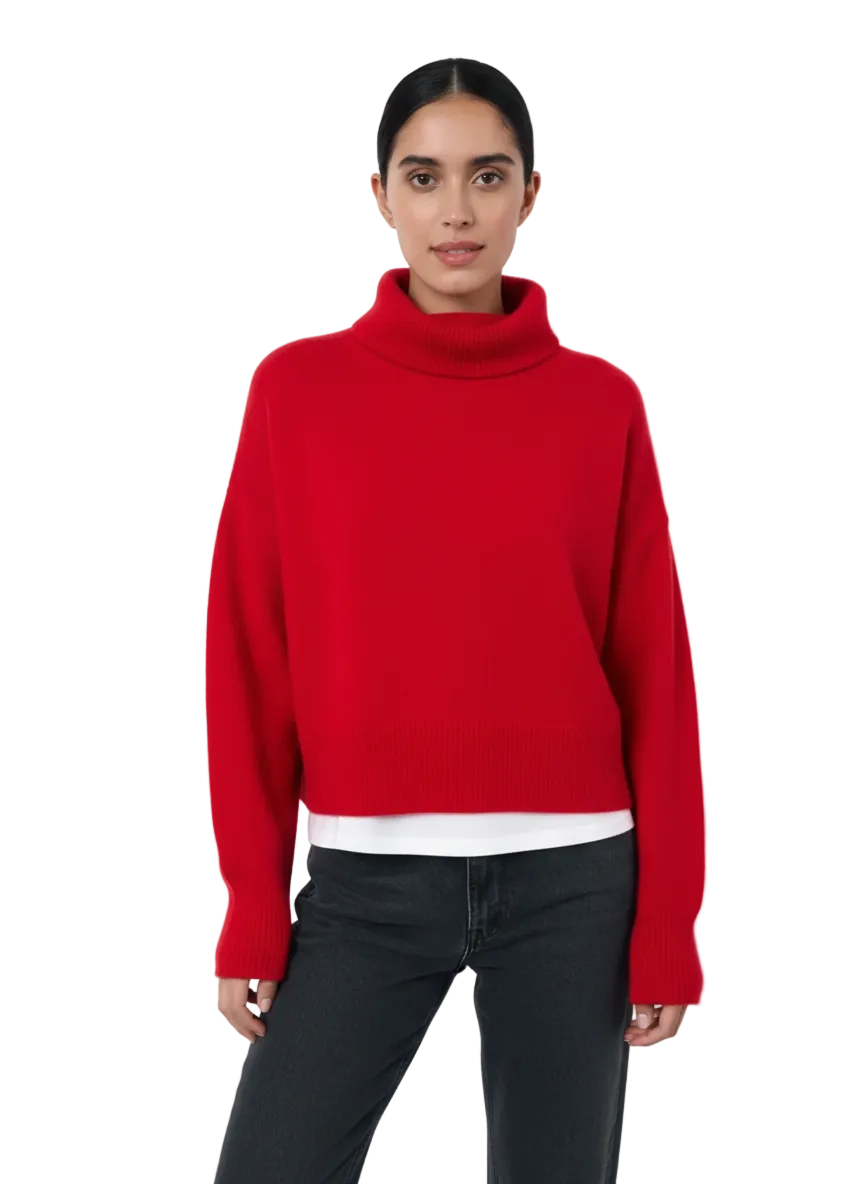 Oversized rolák Katalina pro ženy spojuje obklopující pohodlí a výrazný styl. Jeho volný střih nabízí příjemný a uvolněný pocit, zatímco jeho sytě červená barva přináší do vašeho šatníku dynamický a moderní nádech.