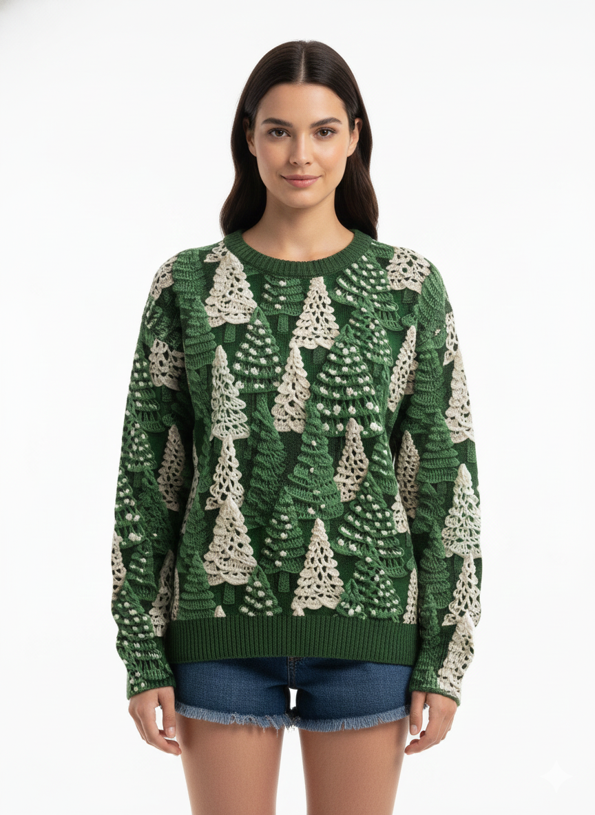 Holly Damen Weihnachtspullover – Weicher Rundhalsausschnitt mit Tannenbaum-Motiven & langen Ärmeln