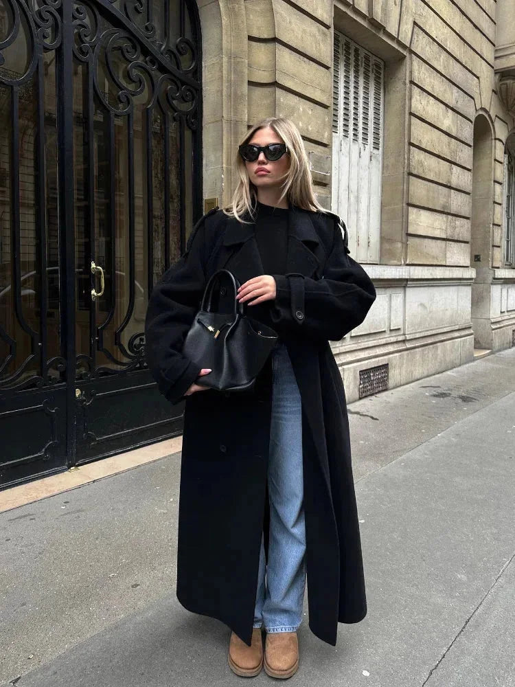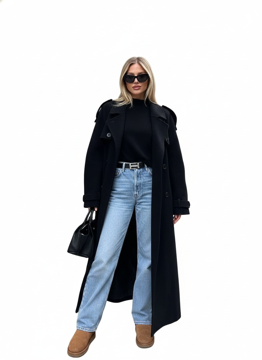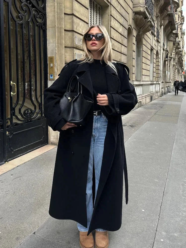 Milan Black Coat for Women – Wide Elegant Lapels, Adjustable Belt & City Style