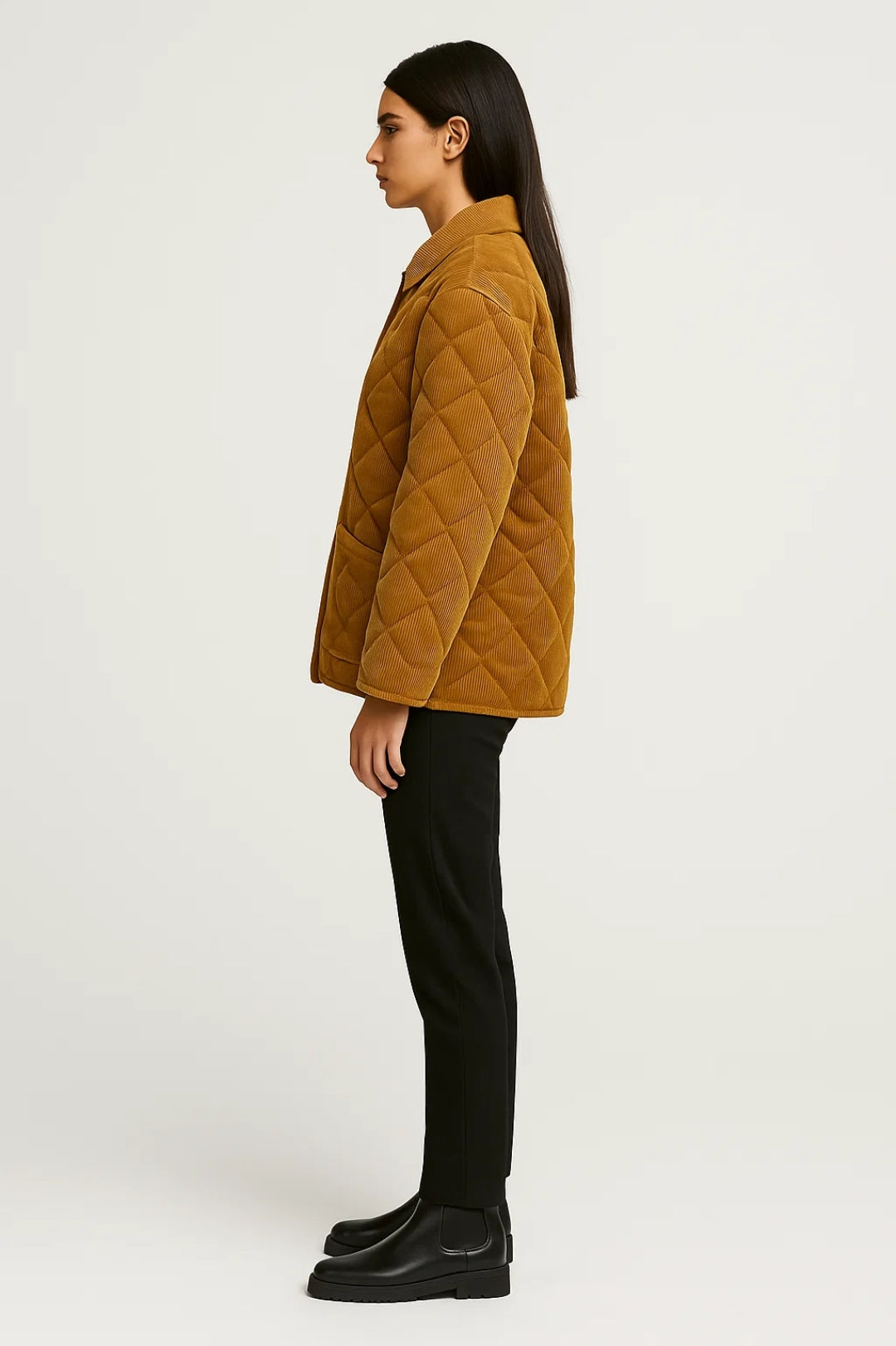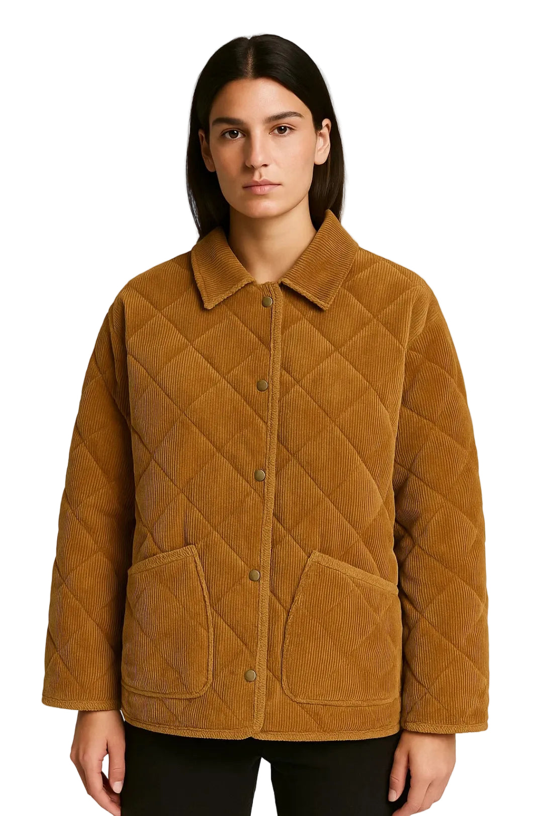 Dzięki wygodnemu, prostemu krojowi, ta kurtka zapewnia dużą swobodę ruchów i łatwo nakłada się na lekki sweter lub top. Zapięcie na zatrzaski z przodu umożliwia szybkie i proste zakładanie, a funkcjonalne naszywane kieszenie dodają praktyczności, nie zaburzając estetyki.