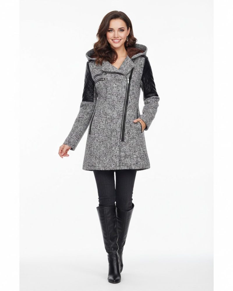 Breya Manteau Femme à Capuche – Style Tweed, Finitions Simili Cuir & Coupe Structurée